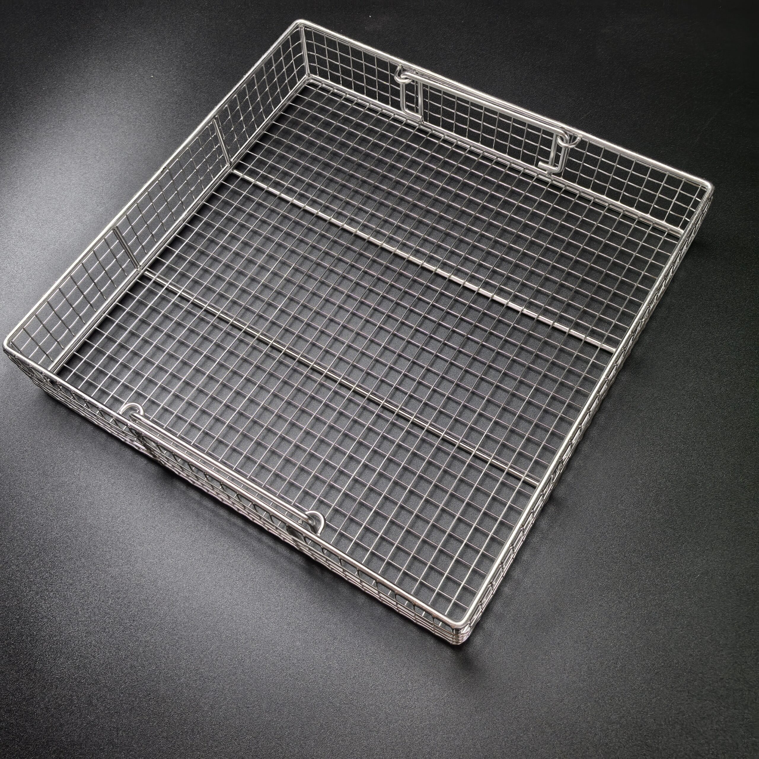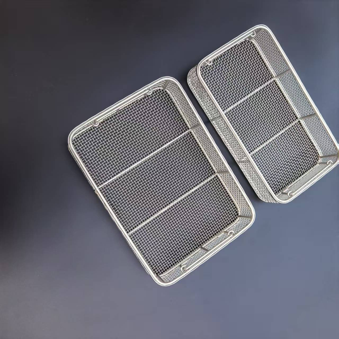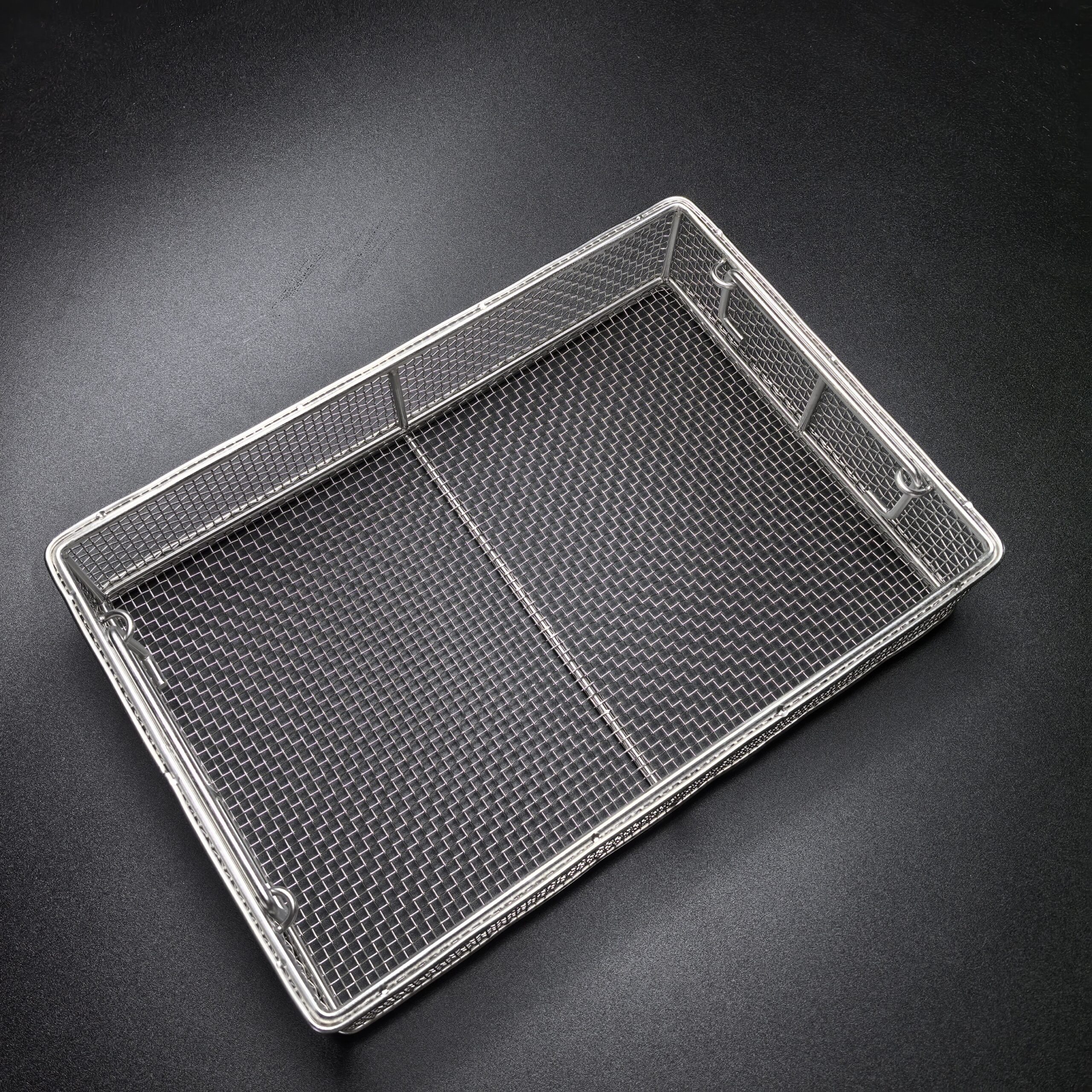 The Stainless Steel Sterilization Mesh Rack is manufactured from stainless steel and undergoes electropolishing for its surface treatment. This process ensures the rack is durable, boasts a mirror-like finish, resists rust, and prevents deformation.