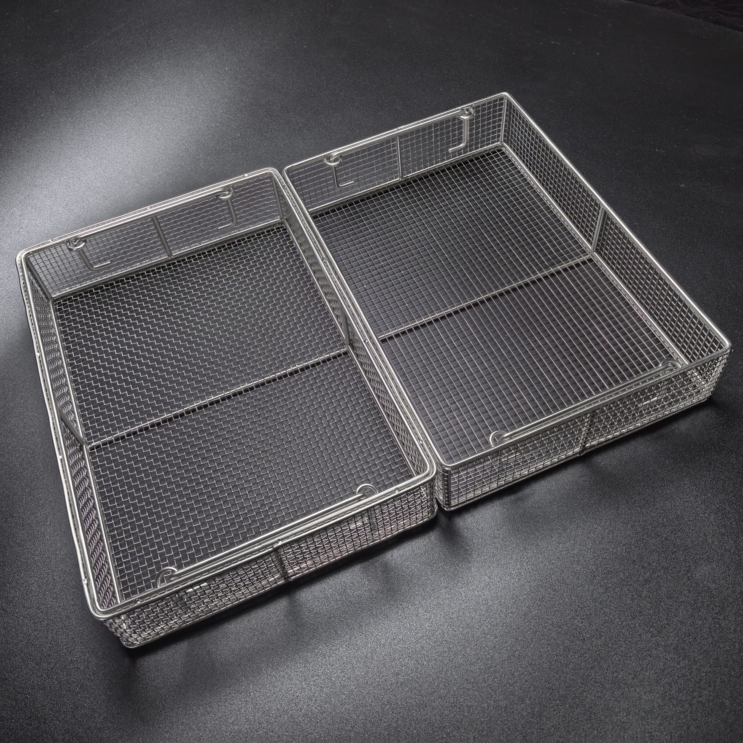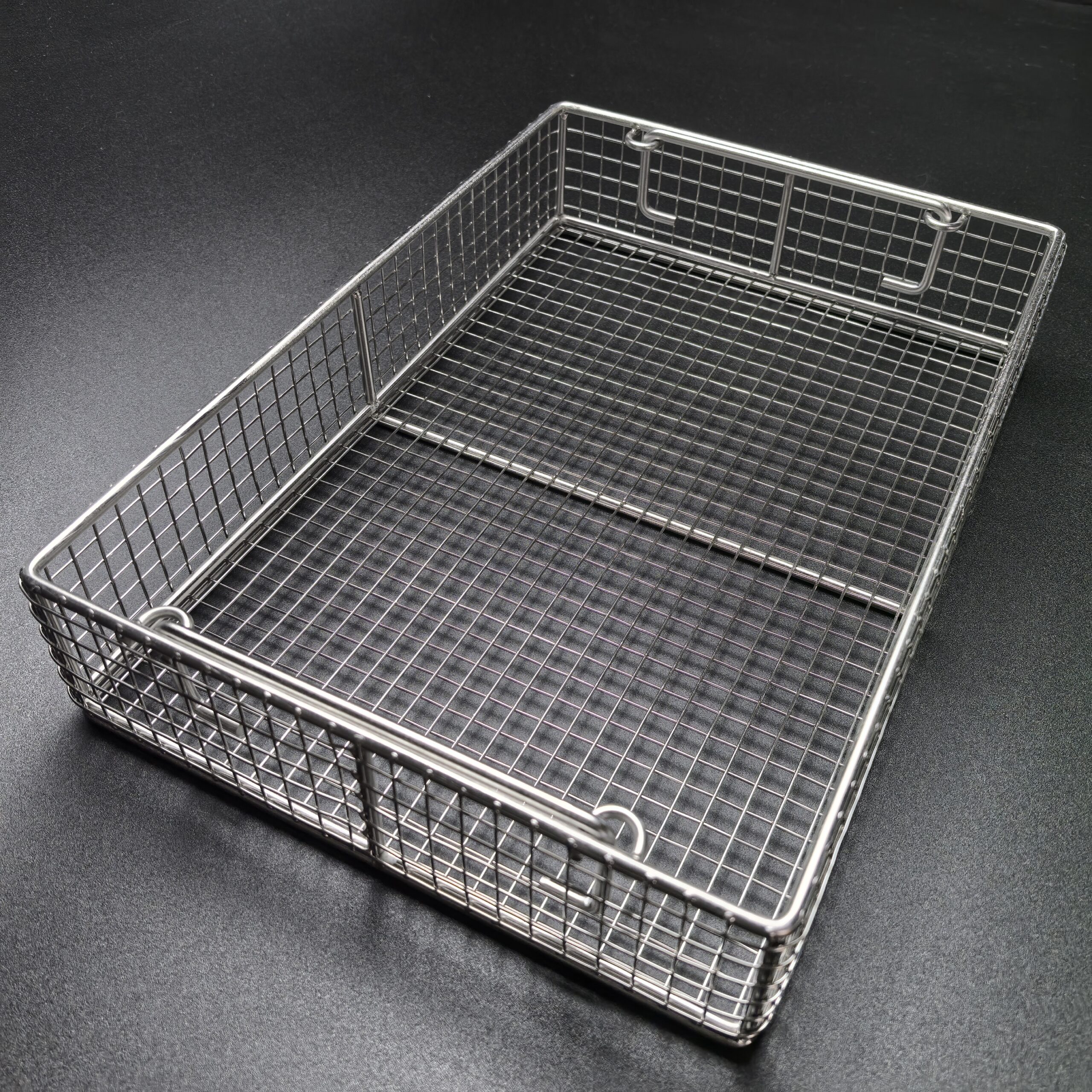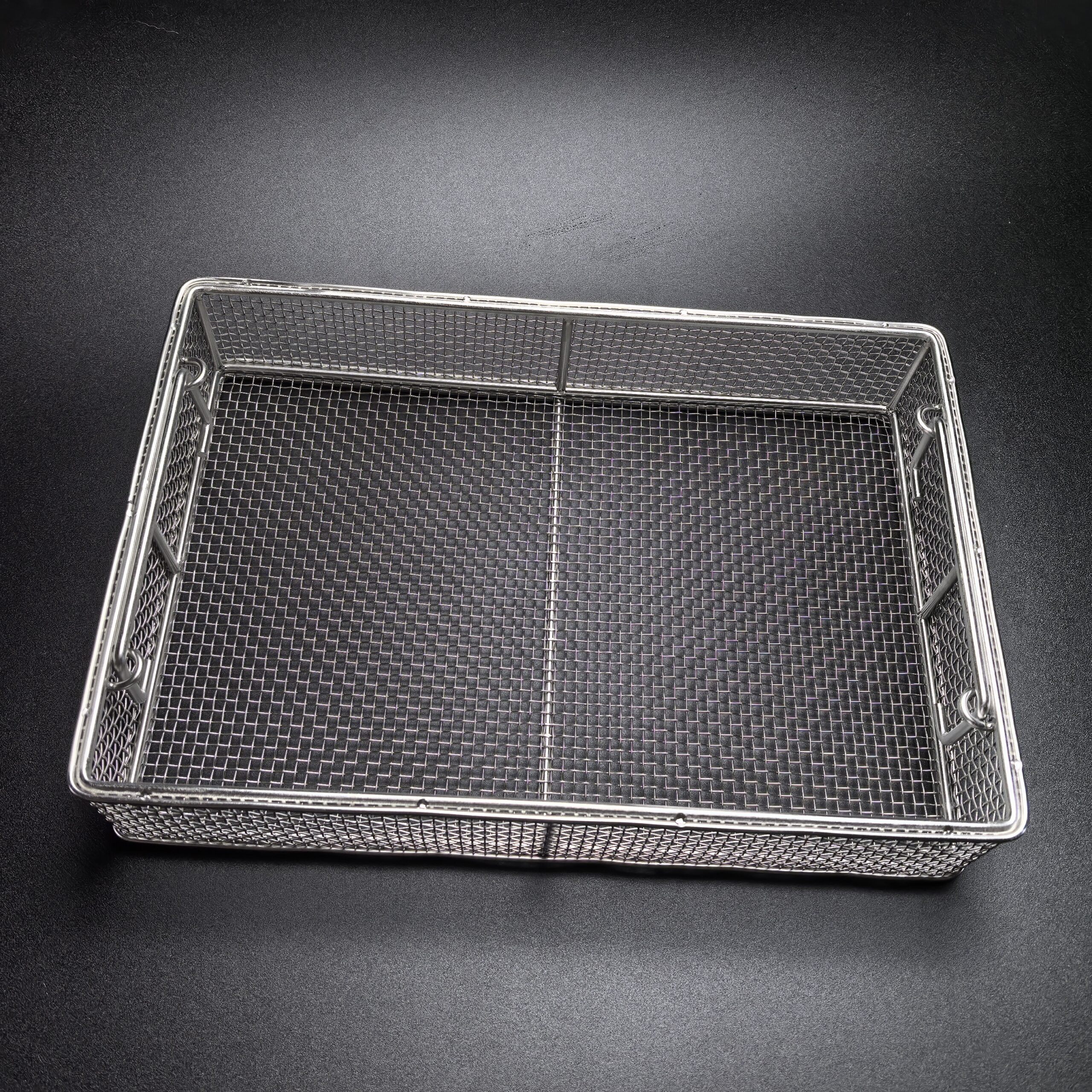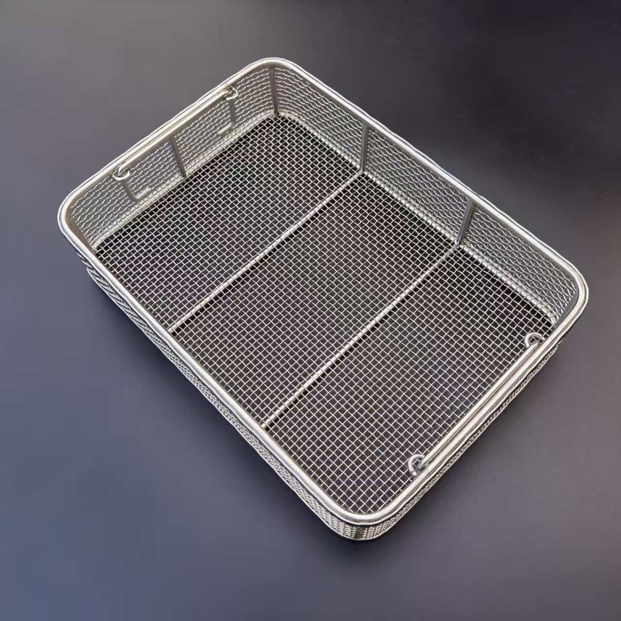 The Stainless Steel Sterilization Mesh Rack is manufactured from stainless steel and undergoes electropolishing for its surface treatment. This process ensures the rack is durable, boasts a mirror-like finish, resists rust, and prevents deformation.